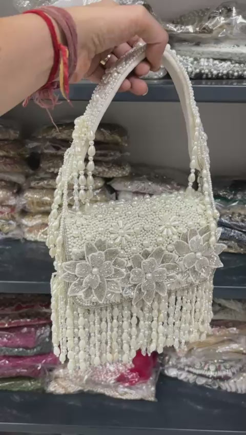 White Pearl Floral Handbag – Handmade Designer Bridal & Party Purse by Fashion Fusion India